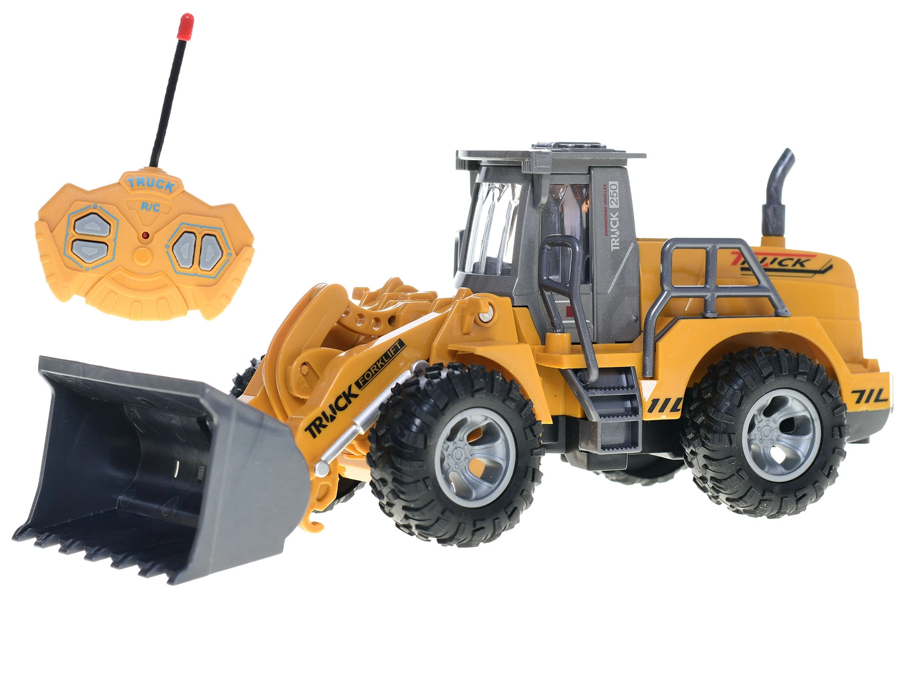 Daljinski upravljalnik s frekvenco 27 MHz omogoča vožnjo naprej, nazaj, zavijanje v stran ter natančno upravljanje nakladalne žlice. Za delovanje je potrebno 5× AA baterij (niso priložene). Primerno za otroke od 3 let – idealna igrača za male graditelje, ki razvija motoriko, domišljijo in koordinacijo.