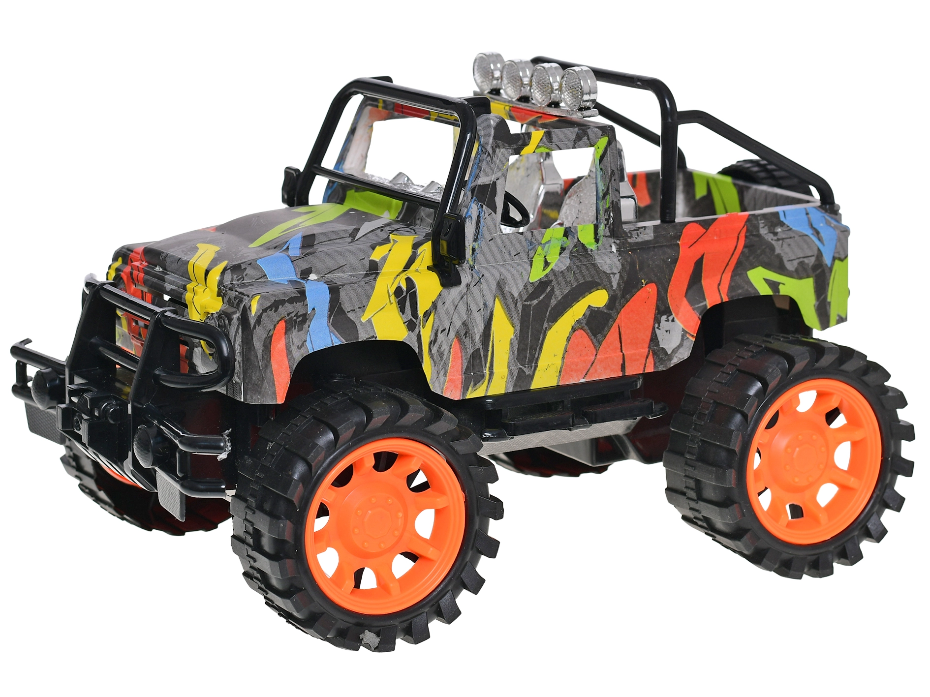 Sodoben plastični model terenskega vozila v merilu 1:14 navduši z modernim grafiti dizajnom in prinaša dolgotrajno zabavo brez baterij. Zahvaljujoč pogonu z vztrajnikom je enostaven za upravljanje, ima dolžino 26 cm za realističen vozniški občutek in je primeren za otroke od 3 let dalje.