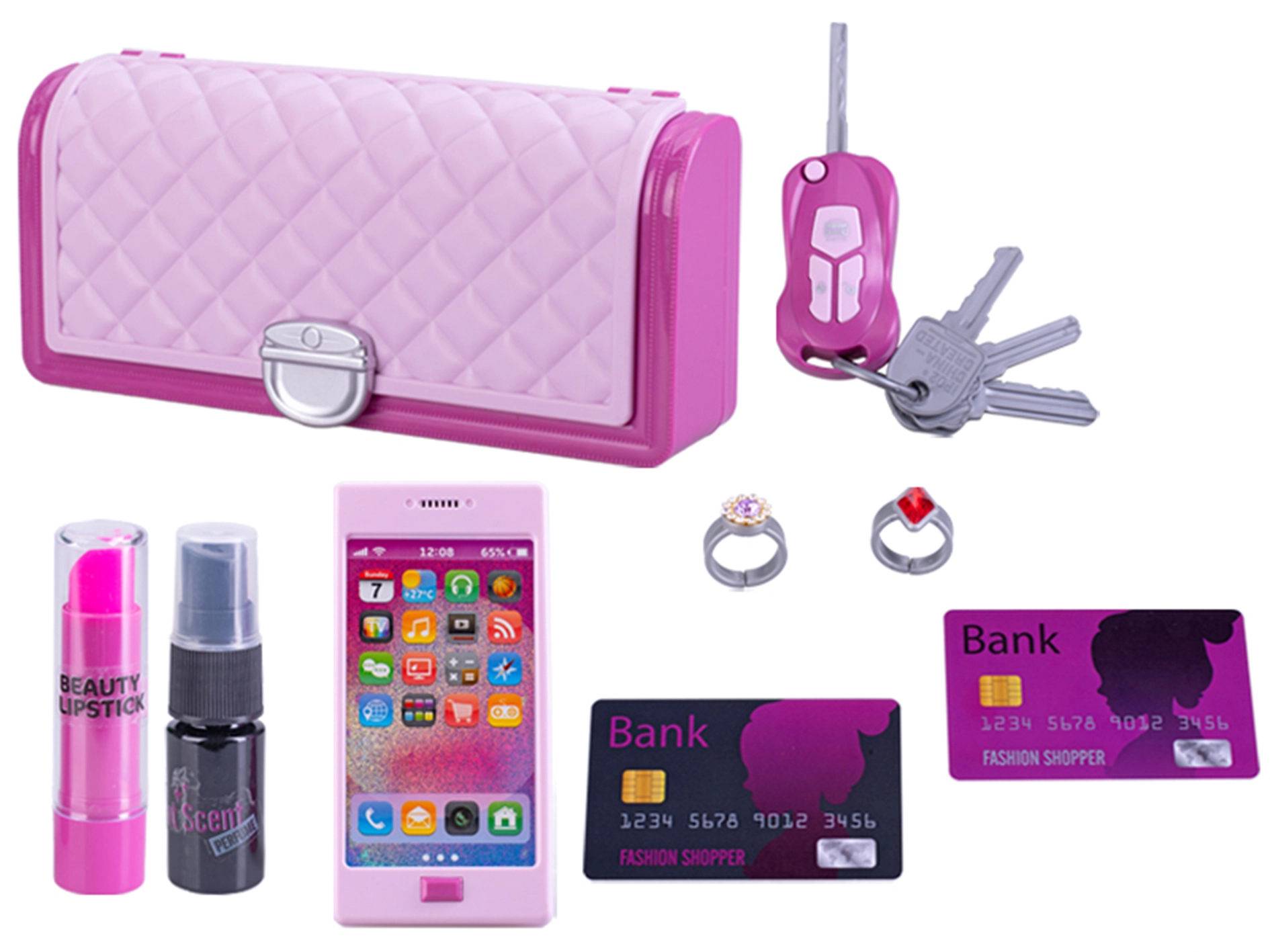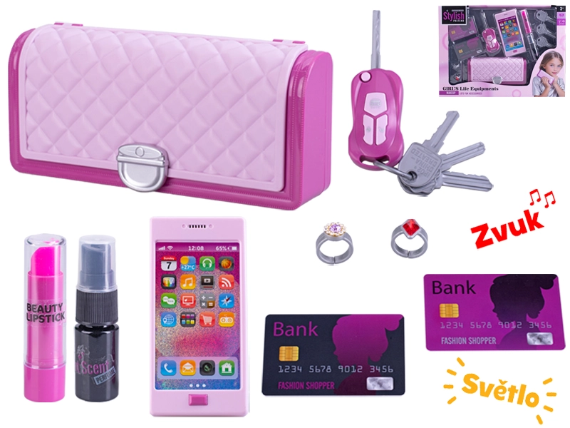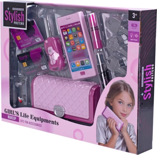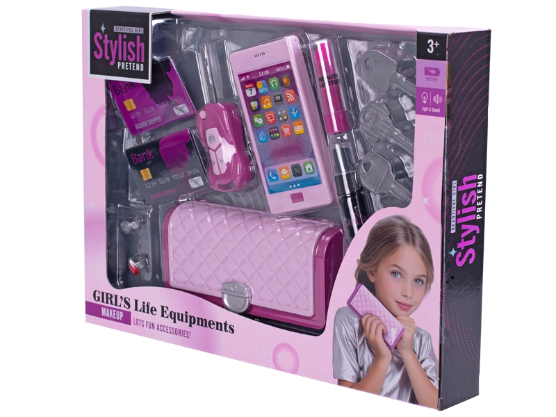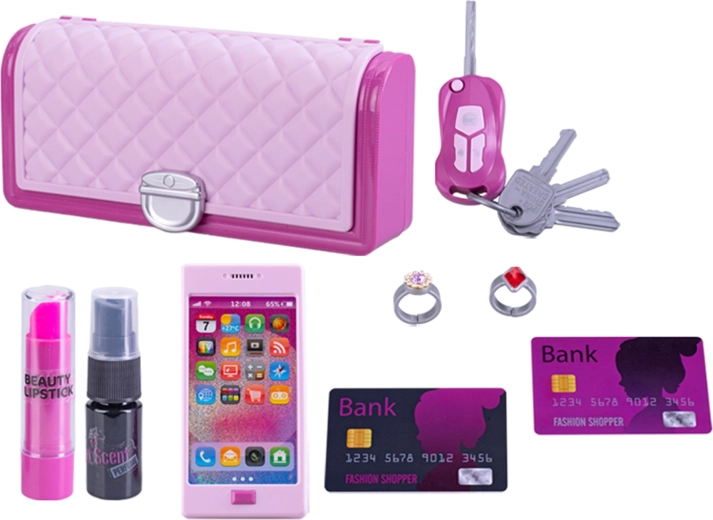 V pakiranju je vse, kar male modne navdušenke potrebujejo: ključek za avto, glavniček, sponke in druge malenkosti. Baterije 3× LR41 so že priložene, zato je treba le odpreti in začeti z igro.