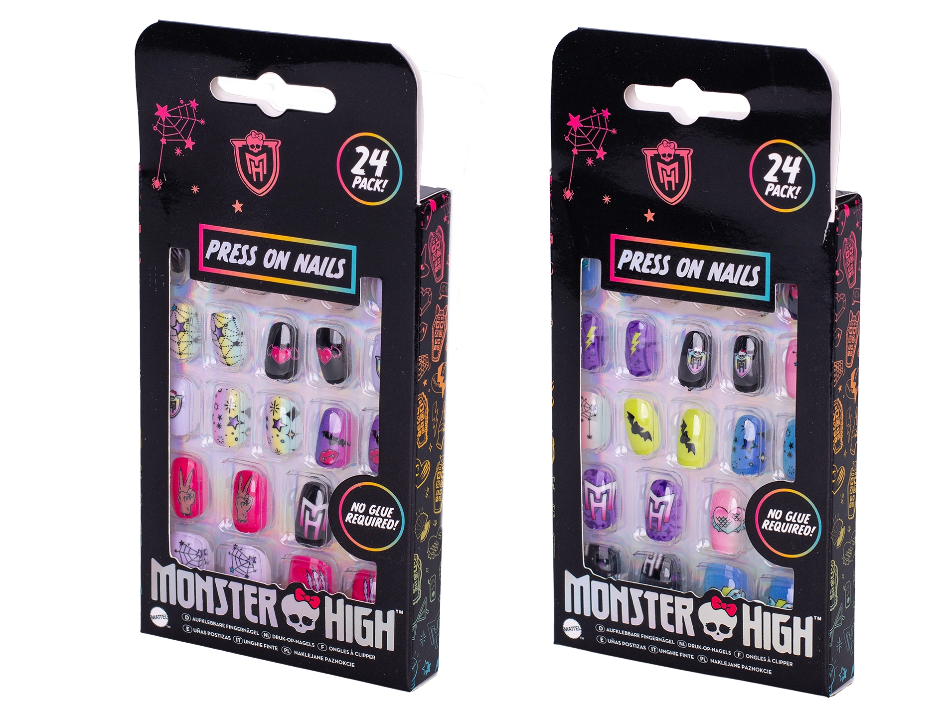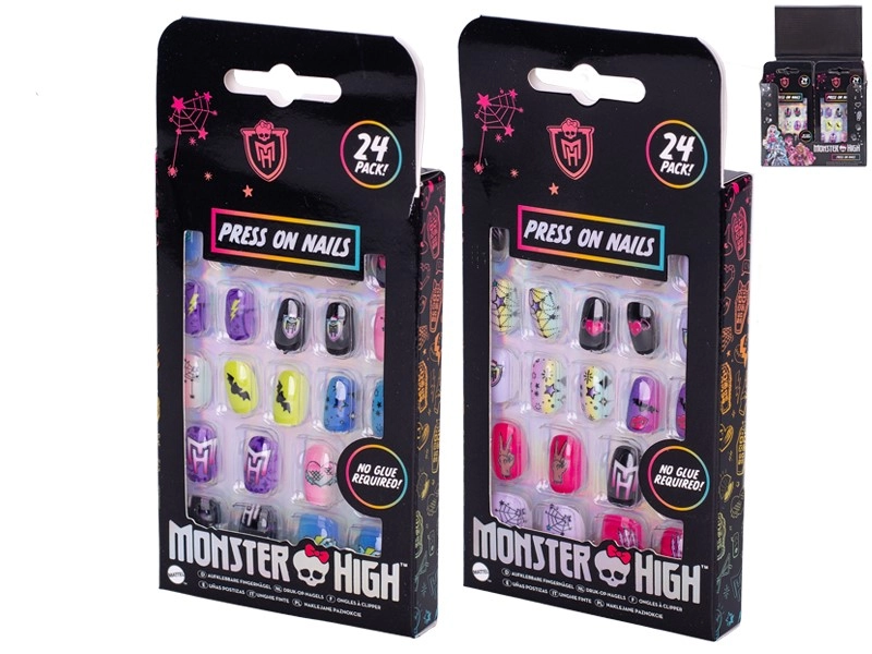 Odkrijte zabaven način, kako dopolniti otroški outfit – nalepni nohti MONSTER HIGH se preprosto nanašajo, držijo zahvaljujoč samolepilni plasti in v hipu spremenijo videz brez nereda in brez potrebe po lepilu. Vsako pakiranje ponuja 24 kosov v pisanih motivih, navdihnjenih s svetom MONSTER HIGH.