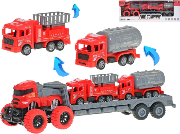 Zaženite akcijo kot pravi gasilci! Vlačilec s prikolico na vztrajnik prevaža dva gasilska avtomobila (cisterna in lestev) dolžine 11 cm z vzvratno vožnjo in premičnimi elementi, ki spodbujajo domišljijo in otroke učijo načel vzroka in posledice.