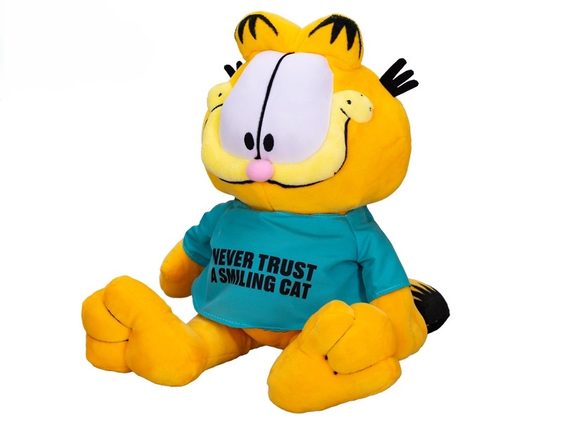 Ljubek plišasti maček GARFIELD v sedečem položaju bo razveselil otroke in zbiratelje. Z višino 28 cm je idealen za crkljanje, izdelan je iz mehke in prijetne tkanine ter nosi trendovsko majico z napisom »Never trust a smiling cat«. Primeren od rojstva, odlično dopolni otroško sobo in razveseli oboževalce ikoničnega mačka.