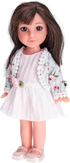 Punčka je na voljo v dveh izvedbah: hlače z naramnicami s črtasto majico za igriv videz ali elegantna obleka z bolerom za slavnostne trenutke. Dobite jo v darilni škatli, zato je odlična za rojstne dni, božič ali kot prijetno presenečenje.