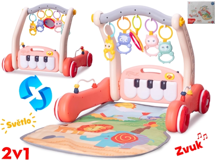 Premišljeni komplet združuje mehko barvito podlogo z oporo hodilnika in interaktivno glasbeno ploščo. Z obročem z visečimi živalskimi figuricami, ogledalcem in drsnimi kroglicami otrok aktivno uri čute in fino motoriko. Odstranljive obeske je mogoče uporabiti tudi samostojno kot ropotuljice.