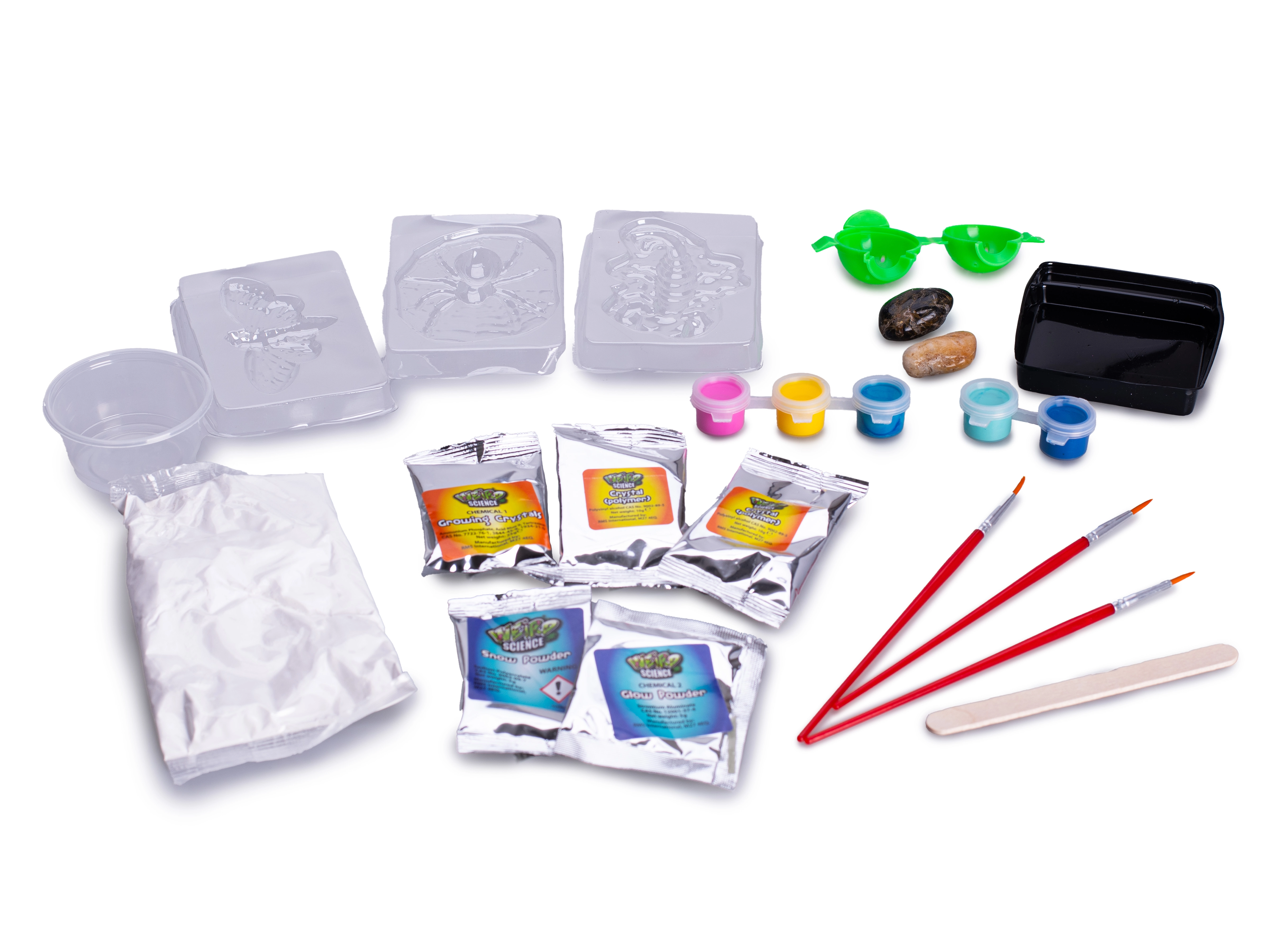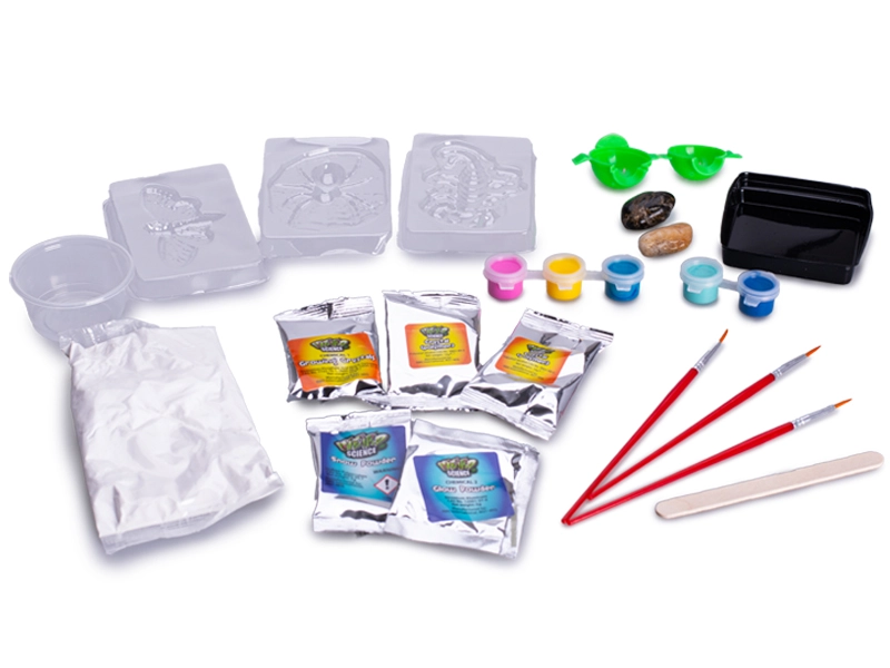 - Obešanka s svetlečimi nalepkami (1×), čopič (3×), barva (5×), polimerni kristali (2×), kalup (različne oblike), kamni (2×), mavec (1× pakiranje), zmes za rast kristalov (1×), svetleči prah (1×), lesena paličica (1×), PVC podloga (1×), kalupi za žuželke (3×), posodica za mešanje (1×)