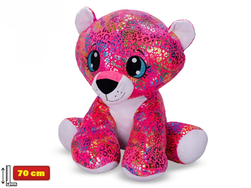 Prisrčen plišasti leopard z mavričnim obarvanjem in bleščečimi detajli na ušesih in tačkah bo na prvi pogled osvojil otroška srca. Z višino 70 cm v sedečem položaju je idealen za crkljanje in kot dekoracija otroške sobe. Mehak, kakovosten pliš zagotavlja maksimalno udobje in varno igro za otroke od 3 let dalje.