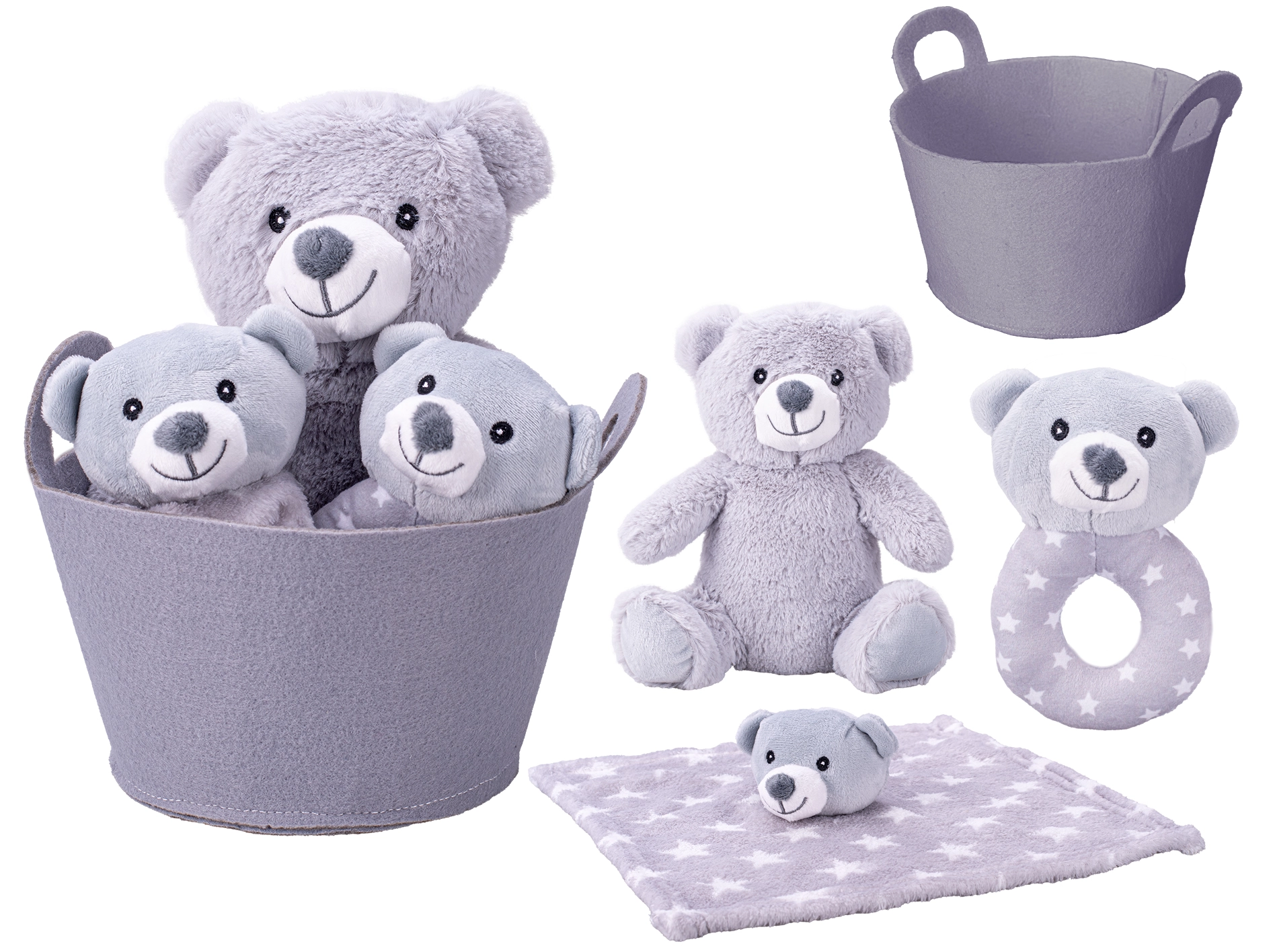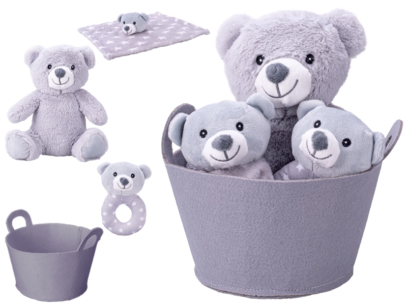 Iščete ljubko in praktično darilo ob rojstvu otroka? Ta darilni set v nežni sivi barvi bo razveselil tako dojenčka kot starše. Mehki medvedek bo postal prvi prijatelj, ropotuljica spodbuja čutno zaznavanje, ninica pa pomaga ustvariti občutek varnosti pri uspavanju. Stilska košarica dodatno služi kot shranjevalni dodatek za otroško sobo.