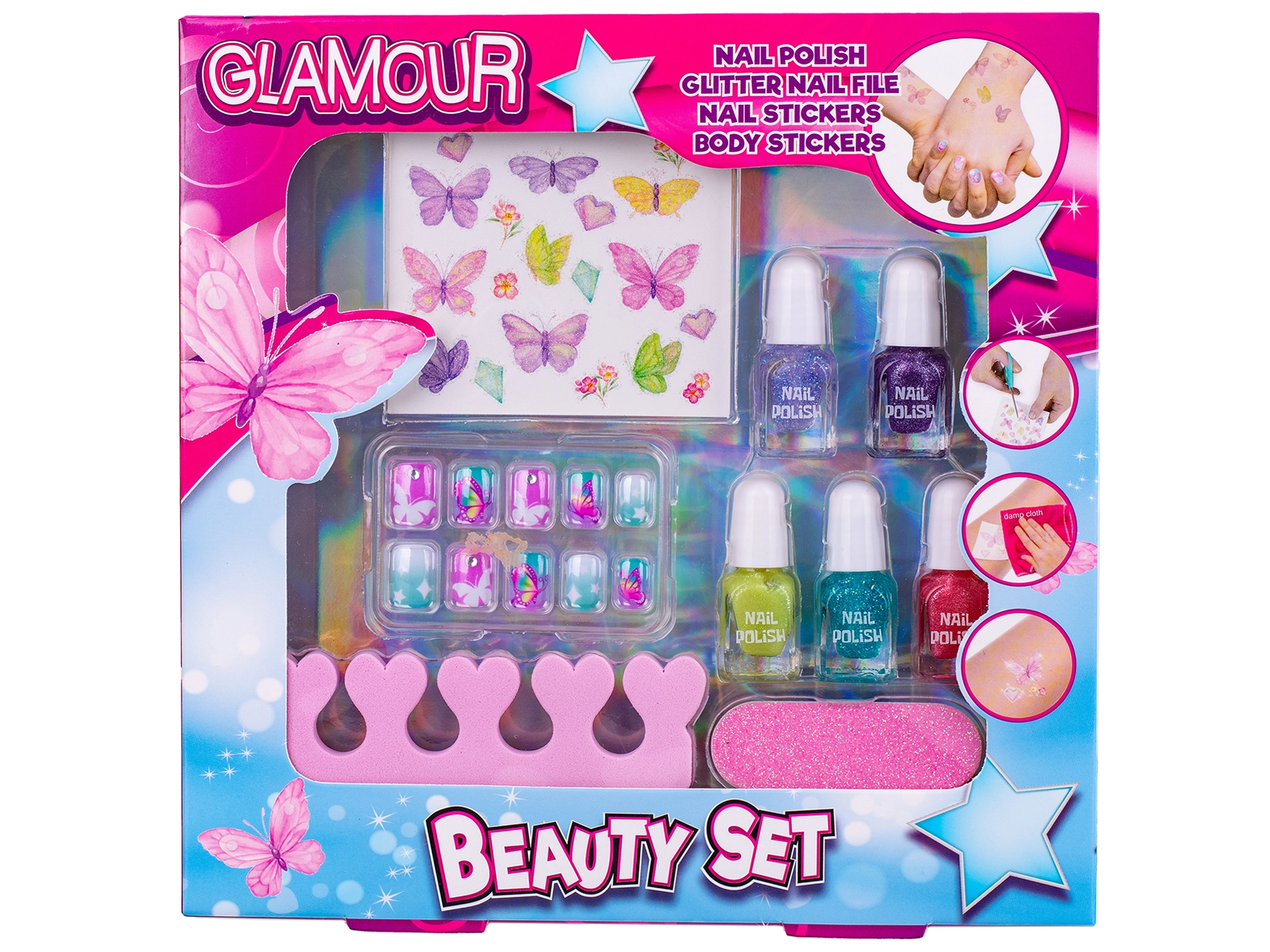 - 5× lak za nohte, 1× pilica, 1× razdelilec prstov, 10× prilepni nohti, 1× list nalepk za telo in nohte