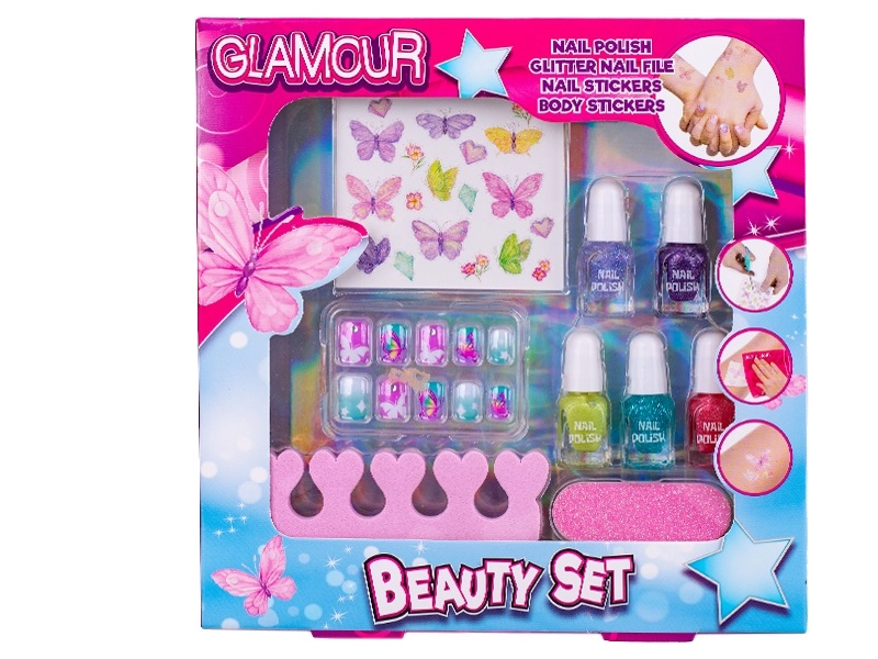 Ta glamurozni lepotni komplet je idealna izbira za prve poskuse z manikiro. Otroci lahko varno preizkušajo različne barve, vzorce in kombinacije ter ustvarjajo izvirne videze po lastni domišljiji. Zahvaljujoč kompaktni embalaži je komplet enostavno prenosljiv in odličen tako za doma kot na poti.