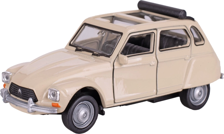 Podrobno izdelan kovinski model legendarnega vozila CITROËN DYANE znamke Welly bo navdušil zbiratelje in otroke. Ponuja vzvratni pogon za zabavno vožnjo, vzdržljivo kovinsko izvedbo s plastičnimi detajli in avtentičen dizajn. Na voljo v treh barvah – modri, beli in oranžni. Idealno darilo za otroke od 3 let ter ljubitelje klasičnih avtomobilov.