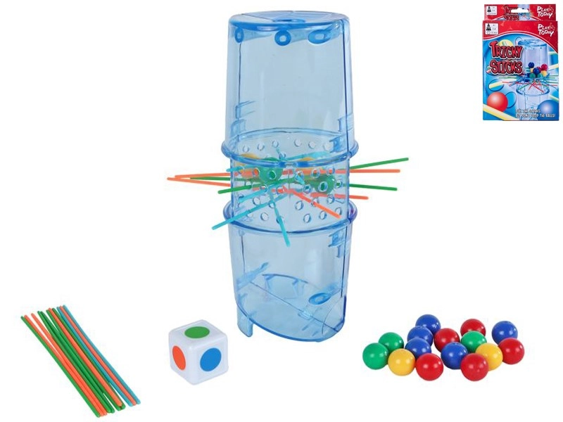 Odkrijte zabavo z igro Play Today Tricky Stick Mikado – sodobno različico priljubljenega mikada s prozornim stolpom, barvnimi paličicami in kroglicami. Igralci izmenično vlečejo paličice tako, da pade čim manj kroglic. Zmaga tisti, ki mu na koncu igre pade najmanj.