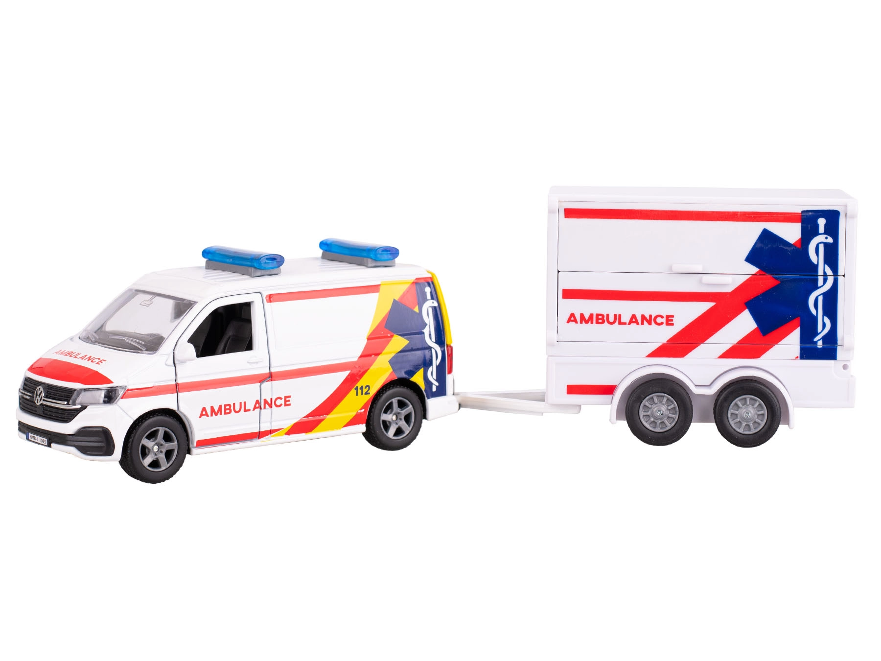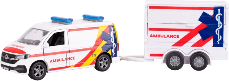 Realističen model reševalnega vozila VW Transporter v merilu 1:16 bo navdušil male in velike ljubitelje avtomobilov. Združuje kovino in plastiko za vzdržljivost in nizko težo, ima povratni pogon, odpirajoča se vrata, del kompleta pa je tudi prikolica za še več igralnih možnosti. Dolžina 27,5 cm, idealno za igro doma in na prostem, primerno za otroke od 3 let.