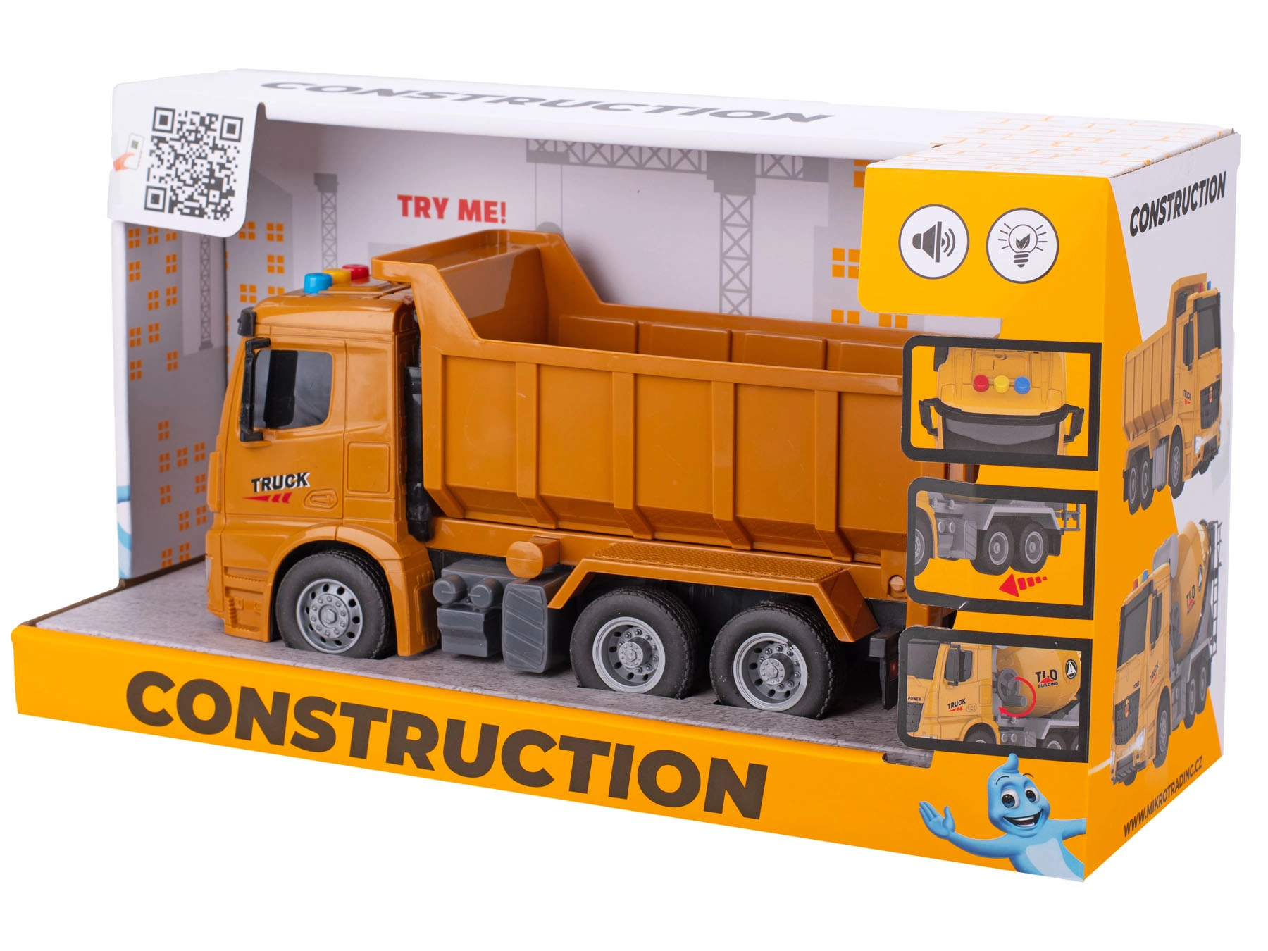 Za še večjo pristnost ne manjkajo svetlobni in zvočni učinki, ki se aktivirajo s pritiskom na gumb. Nagibni keson omogoča nakladanje in razkladanje »materiala« kot pri pravem tovornjaku. Trpežen plastični material je primeren za igro doma in na prostem, igrača pa je varna za otroke od 3. leta dalje.