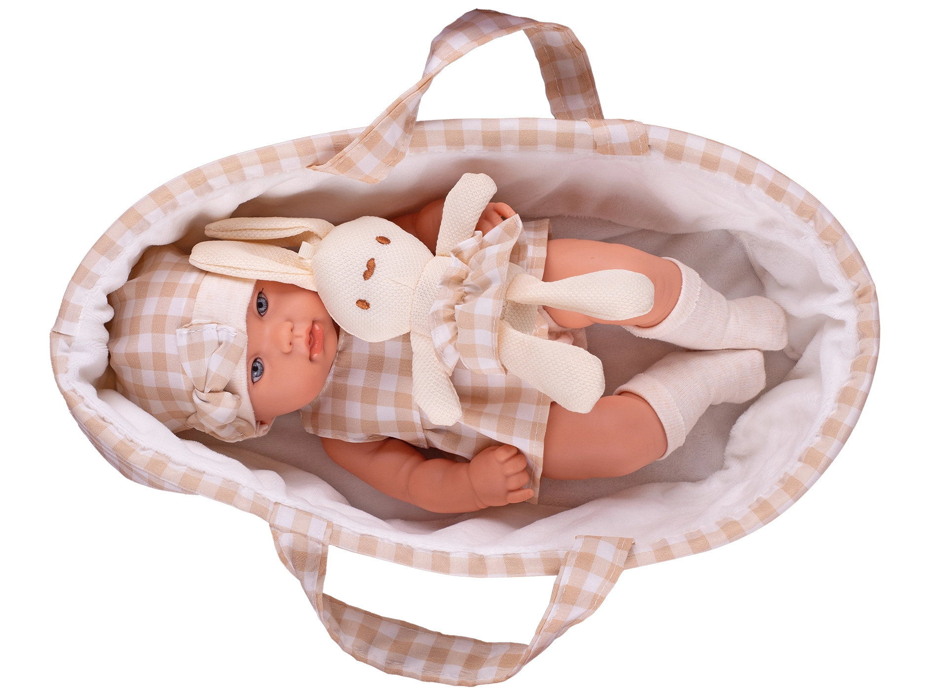- Celovit komplet: punčka, nosilka in plišasti zajček v ujemajočih se bež odtenkih.