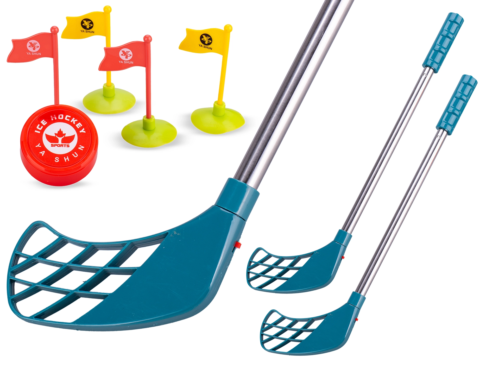 Set je izdelan iz trpežnega plastičnega materiala, je lahek za prenašanje in enostaven za sestavljanje. Odlična izbira za domače tekme med sorojenci, otroške zabave in vadbo osnovnih veščin – držanje palice, vodenje ploščka in natančnost strela. Pakiranje vsebuje vse potrebno za takojšnjo igro, vključno z baterijami.