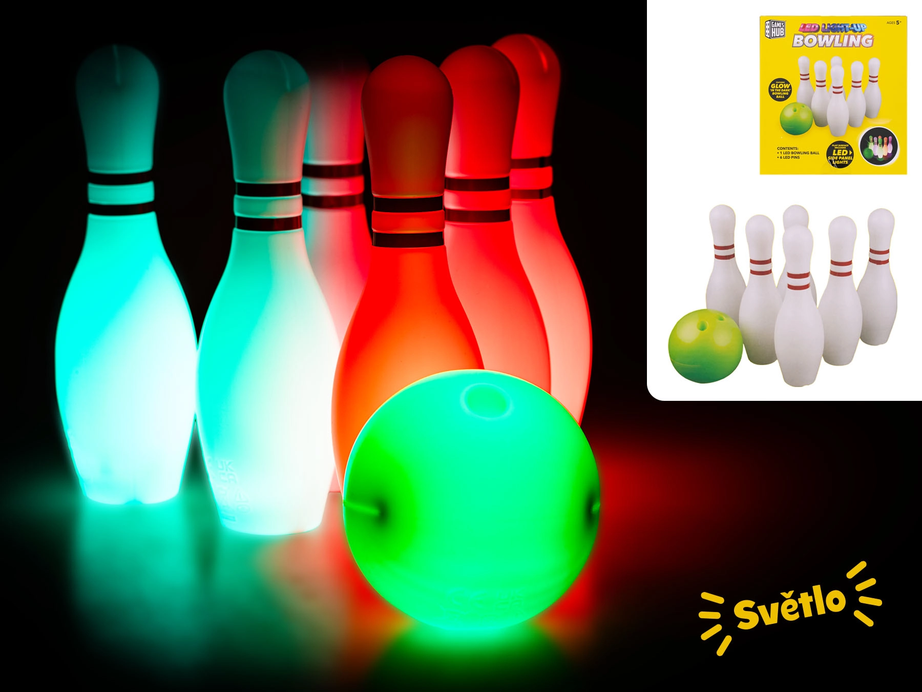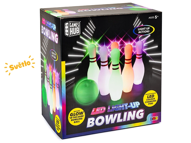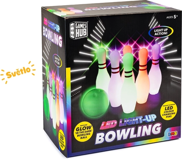 Uživajte v družinski zabavi s tem bowling kompletom za otroke od 5 let. Vsebuje 6 kegljev visokih 25,5 cm in posebno žogico, ki po aktivaciji sveti zahvaljujoč LED diodam. Svetlobni učinek doda igri čar tudi v mraku, razvija motoriko in koordinacijo in je zaradi kompaktnih mer primeren za notranjo in zunanjo uporabo.