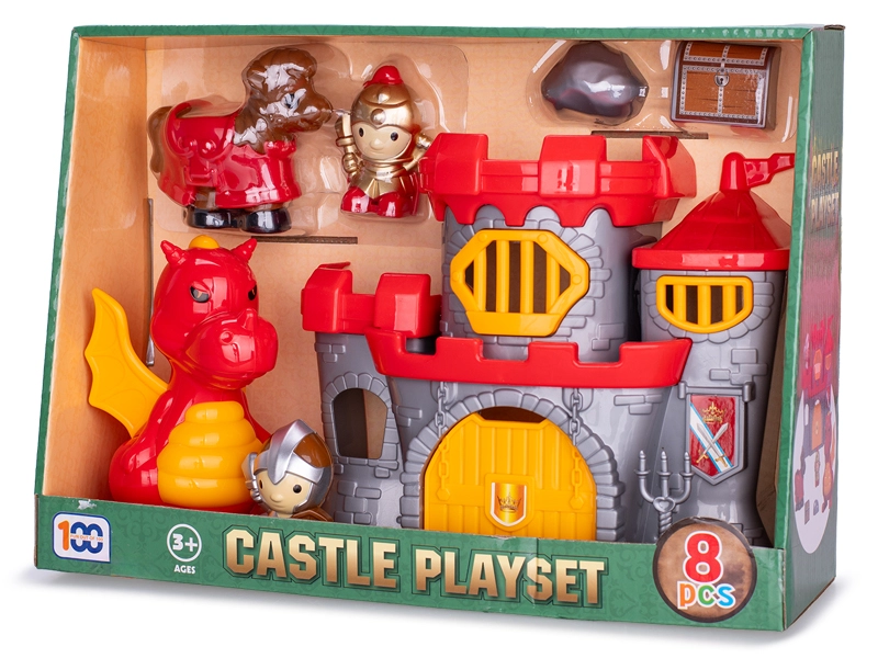 Igrača je izdelana iz kakovostne plastike, kar zagotavlja preprosto vzdrževanje in odpornost pri vsakodnevni igri. Žive barve in tematski elementi otroke popeljejo v svet čarovnije, kjer lahko ustvarjajo lastne dogodivščine z vitezi in zmaji.