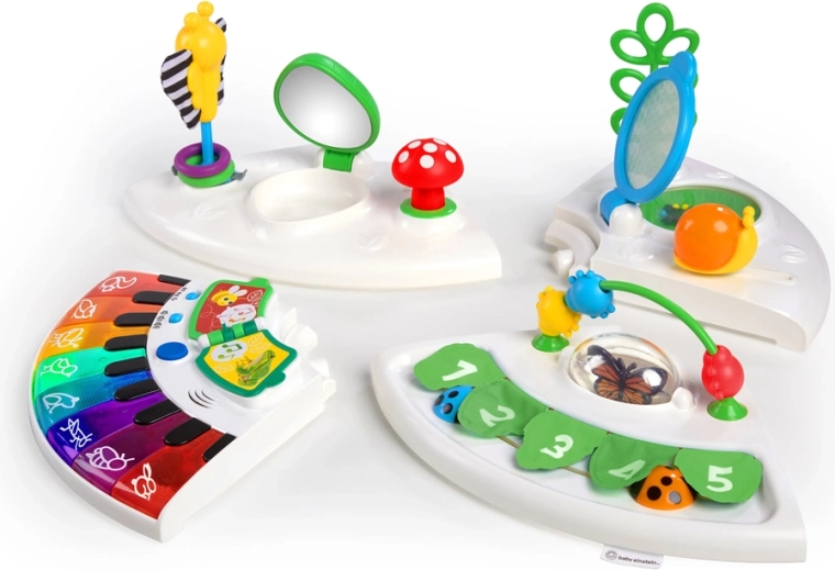 Aktivni center Baby Einstein Around We Grow 4v1 se prilagodi vsaki fazi razvoja. Od stacionarnega hojčka s sedežem do senzorične mizice, odstranljivih igralnih postaj in ravne delovne površine za ustvarjanje – vse v eni pametni rešitvi. Otrok lahko raziskuje več kot 15 igralnih elementov, razvija fino motoriko, razumevanje vzroka in posledice ter se uči barv in poimenovanja živali v angleščini, francoščini in španščini.