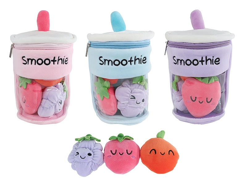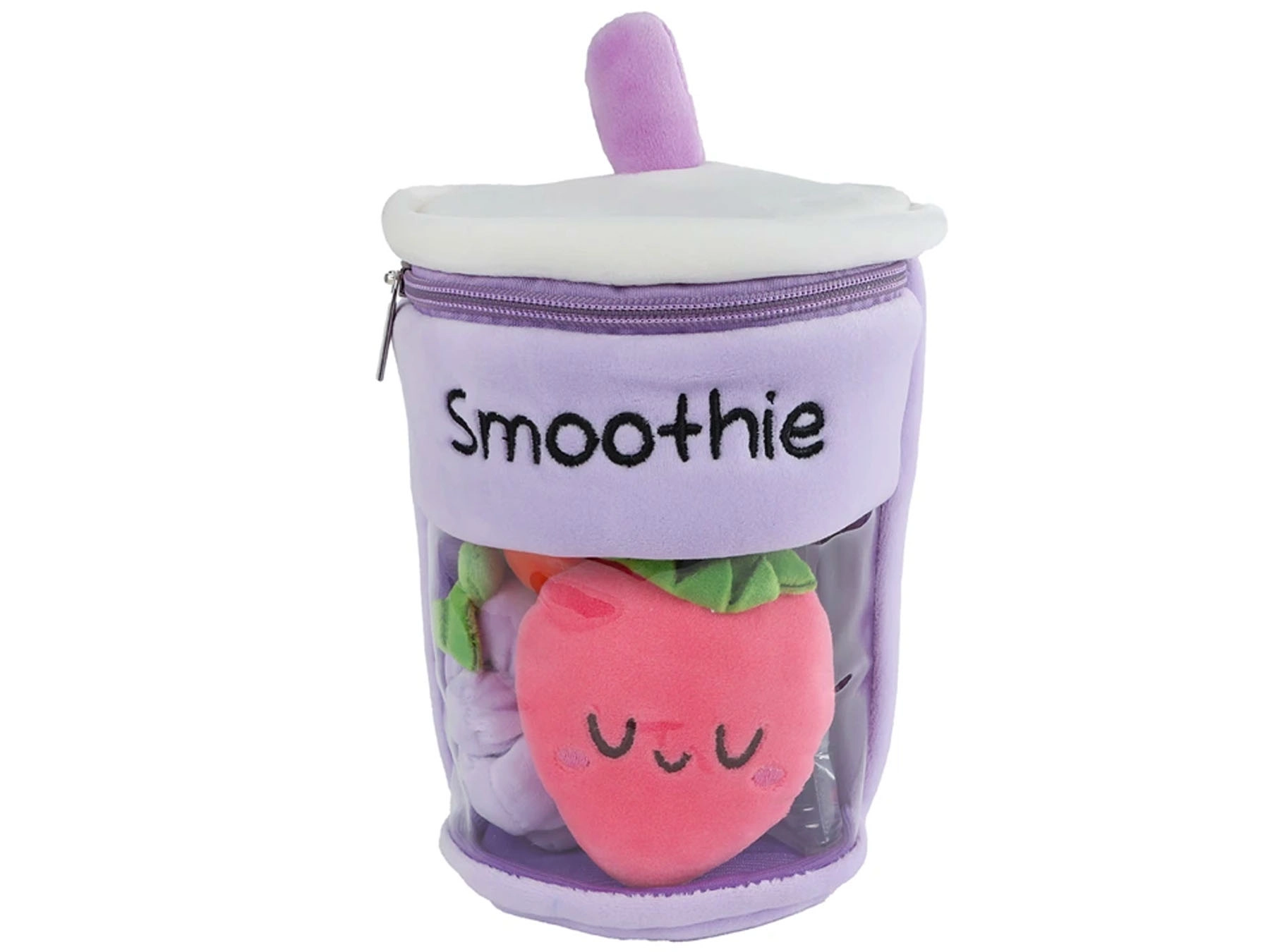 Odkrijte igriv svet s plišastim smoothie lončkom FLUFFY MENU, ki skriva tri simpatične sadne koščke. Z zadrgo preprosto odprite lonček, vzemite ven jagodo, borovnico ali druge plodove in pustite otrokom, da ustvarjajo lastne zgodbe. Mehkužen material je prijeten na dotik in idealen za vsakodnevno cartanje.