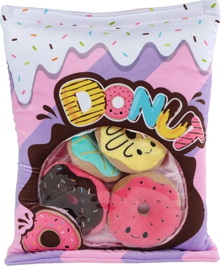 Mehka plišasta torba služi ne le kot ovitek, temveč tudi kot praktičen organizator – otroci se učijo pospravljati igrače, razvrščati in vzdrževati red. Teksture in oblike krofov spodbujajo tipno zaznavanje, razvoj fine motorike in koordinacijo oko–roka že od najzgodnejše starosti.