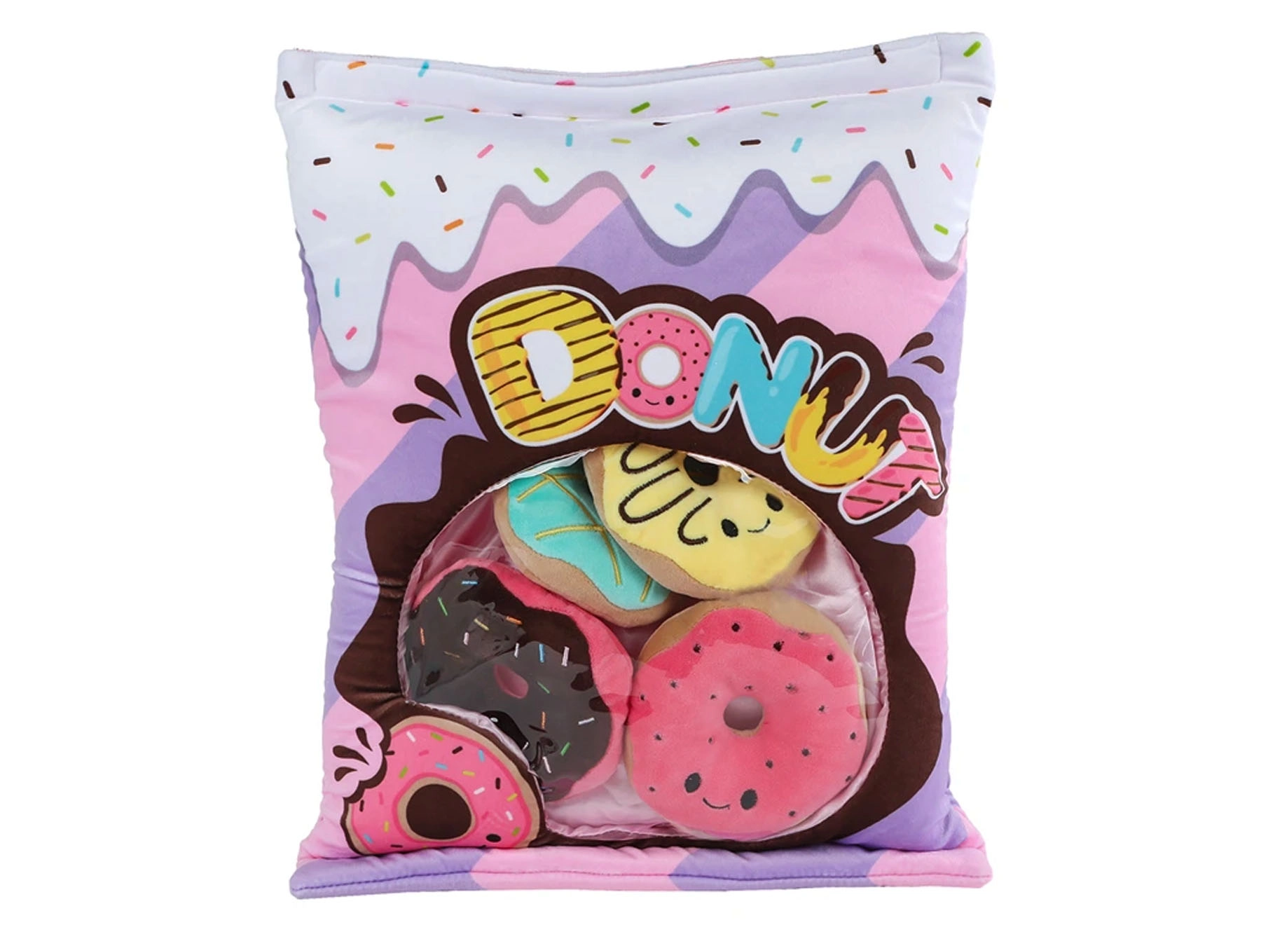 Plišasti set barvitih krofov Fluffy Menu je idealna izbira za najmlajše otroke in starše, ki iščejo varno, kakovostno in estetsko igračo. Štirje mehki krofi z veselimi izrazi vabijo k dotikanju, stiskanju in igri vlog, hkrati pa čudovito krasijo otroško sobico.