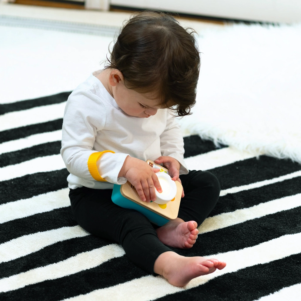 Odkrijte zabavno učenje z interaktivnim fotoaparatom BABY EINSTEIN x HAPE, ki združuje svetlobne učinke, melodije in učenje barv v 4 jezikih. Otroci vadijo fino motoriko, razumejo vzrok in posledico in lahko igračo zahvaljujoč udobnemu paščku za zapestje odnesejo kamor koli. Lesena površina s FSC certifikatom in retro dizajn odlično pristajata malim ročicam.