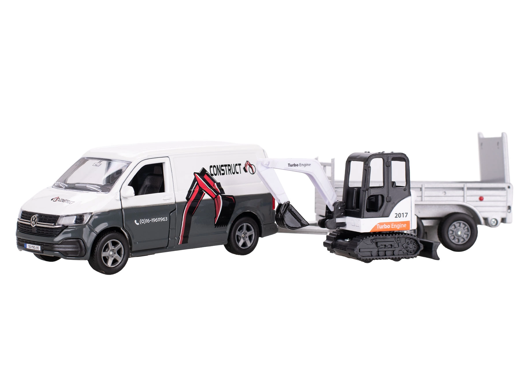 - Realističen set: VW Transporter, snemljiva prikolica in funkcionalni mini bager