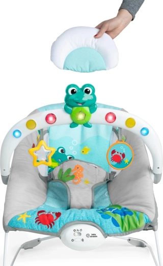 Ležalnik BABY EINSTEIN Ocean Explorers Kick to It Neptune je zasnovan za umirjanje in senzorično stimulacijo. Interaktivna igrača z žabico in ogledalcem, ropotuljica v obliki zvezdice ter barvni trakovi spodbujajo fino motoriko, vizualno zaznavanje in samoodkrivanje. Vgrajene vibracije in melodije pomagajo malčka pomiriti, medtem ko stabilna konstrukcija in varnostni pasovi zagotavljajo zanesljivost pri počitku in igri.