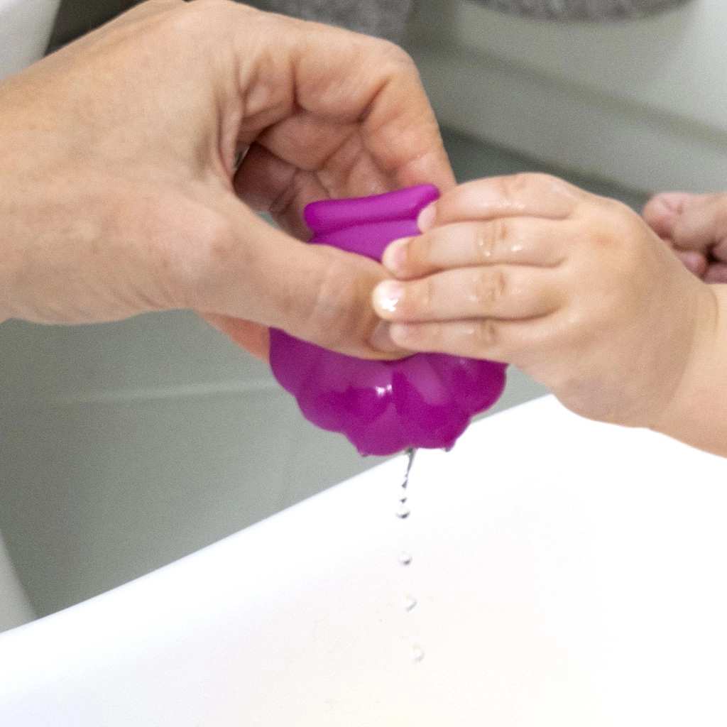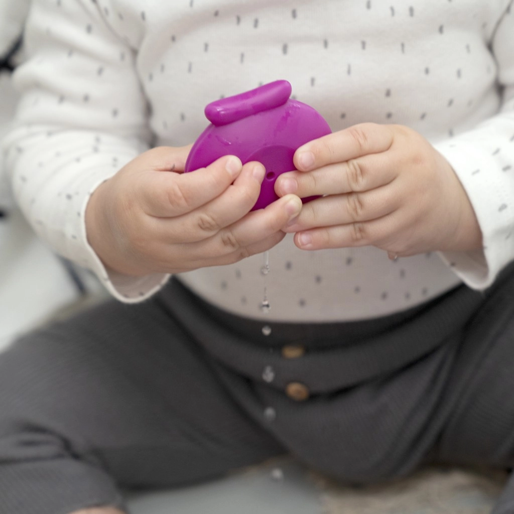 Komplet 5 delov združuje velike, lahko oprijemljive skodelice z različnimi odprtinami za pretakanje in škropljenje ter igrivo pršilko v obliki školjke. Otroci lahko skodelice zlagajo, sestavljajo, vstavljajo in odkrivajo različne teksture, kar naravno razvija koordinacijo roka–oko in senzorično zaznavanje.