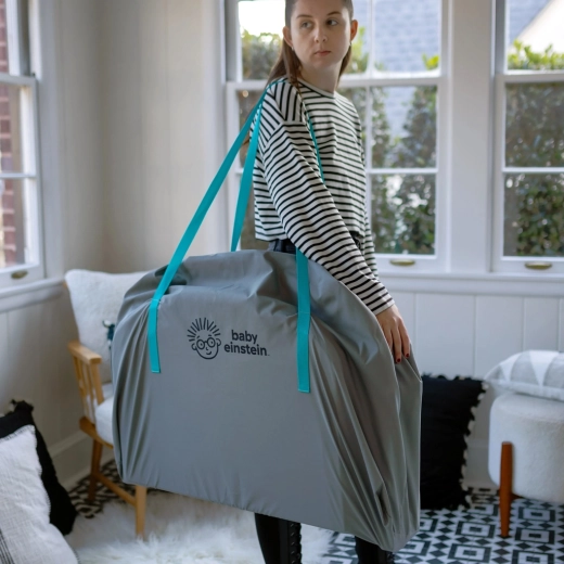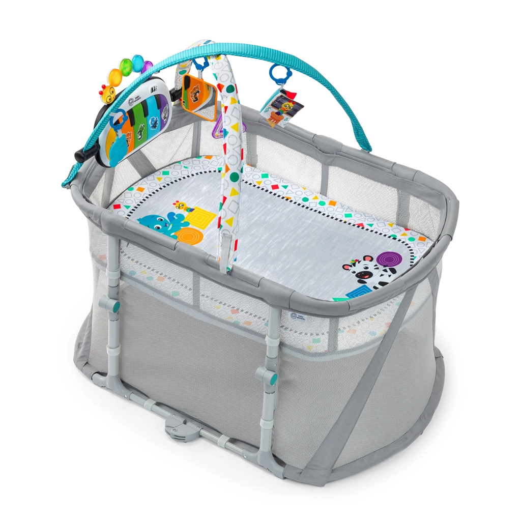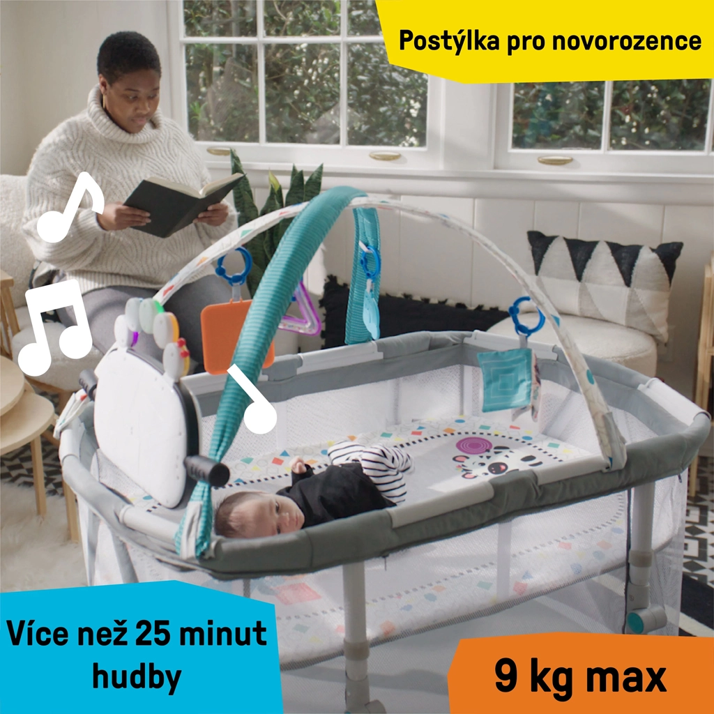 Vsestranska otroška posteljica in ograjeno območje 3v1 znamke Baby Einstein raste z dojenčkom od rojstva. Ponuja zibelko za miren spanec, aktivno igralno podlogo s klavirjem in prostorno ograjeno območje za malčke. Zračne mrežaste stranice, več kot 70 melodij in fraz v 4 jezikih, več kot 25 minut pomirjujoče glasbe in lučk, enostavno čiščenje ter hitro 3‑korakovno zlaganje s potovalno torbo olajšajo vsak dan.