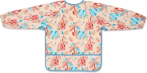 Udobje zagotavljata nastavljivo zapenjanje na ježka, ki se nežno prilagodi vratu, in elastične manšete, ki se dobro prilegajo malim rokam. Praktičen sprednji žep ujame drobtine in kapljajoče tekočine, zato je pospravljanje hitro opravljeno.