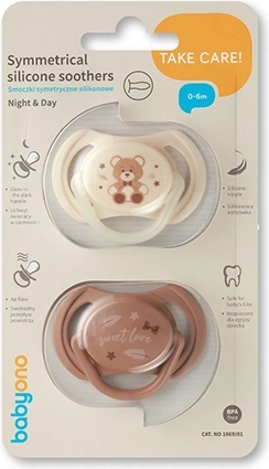 Pomirite svojega dojenčka z nežnim dotikom udobja – komplet vsebuje 2 simetrična silikonska dudka za 0–6 mesecev: enega za dan in enega s svetlečim ročajem za noč. Mehak hipoalergen silikonski cucelj s tankim vratom je nežen do dlesni in zobkov, medtem ko profiliran ščit z zračnimi odprtinami podpira prosto dihanje in ščiti občutljivo kožo. Brez BPA, enostavno čiščenje in sterilizacija.