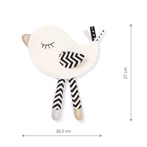 Cartanka Little Birdie iz kolekcije BabyOno Blink&Smile združuje mehkobo, varnost in senzorično stimulacijo, ki jo dojenčki obožujejo. Kontrastni črno-beli elementi pritegnejo pozornost novorojenčkov, medtem ko mehke tkanine in všitki vabijo k raziskovanju s prstki. Lahek in enostavno oprijemljiv oblikovni dizajn je primeren za voziček, posteljico in na pot.