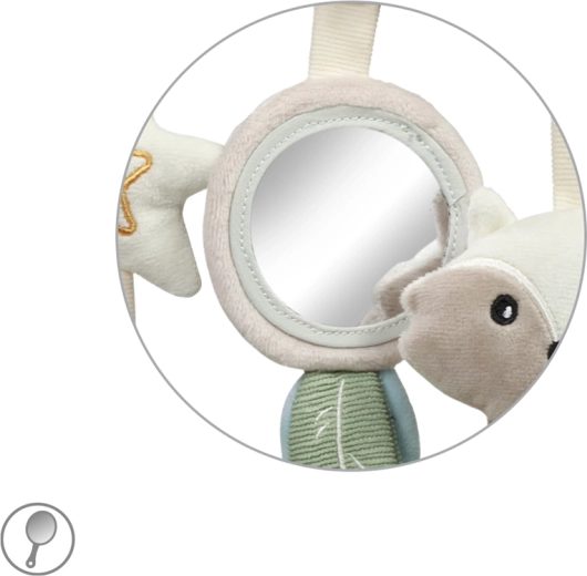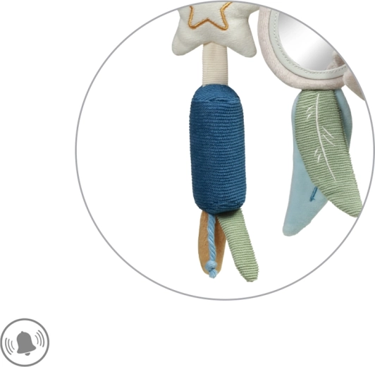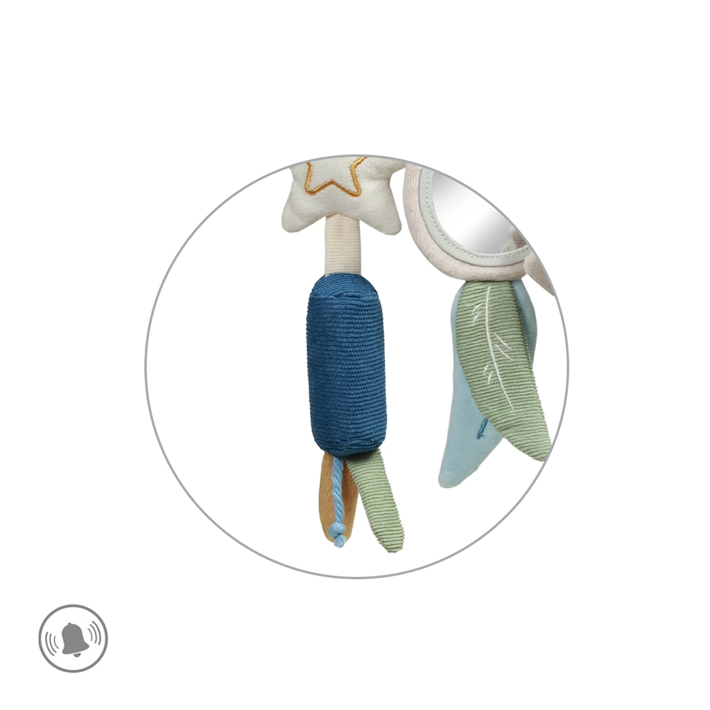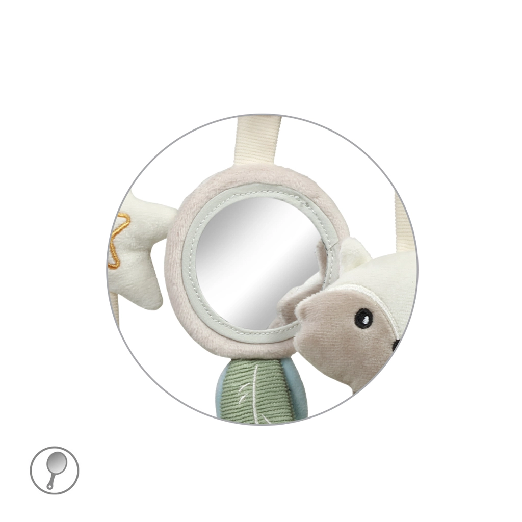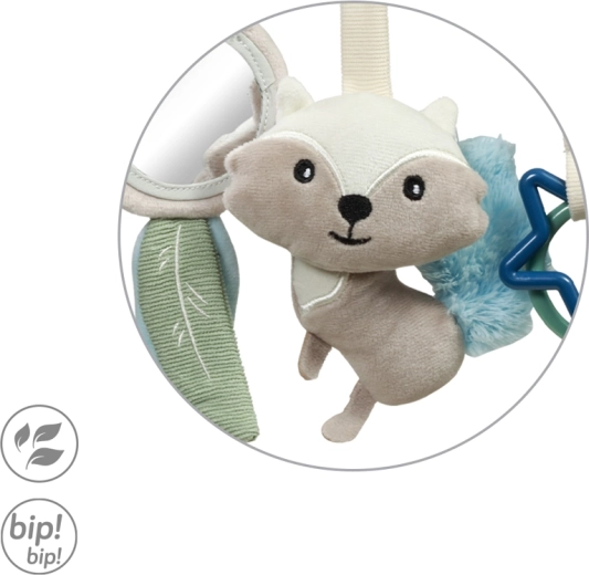 Vključuje priljubljene elemente: prilagodljivo ogledalce za odkrivanje lastnega odseva, šušteče listke in rep rakuna za vadbo pozornosti, nežno zveneče zvončke za pomiritev in grizalo v obliki zvezde za olajšanje ob izraščanju zobkov. Premišljene podrobnosti ohranjajo otrokovo pozornost in spodbujajo koordinacijo roka–oko.