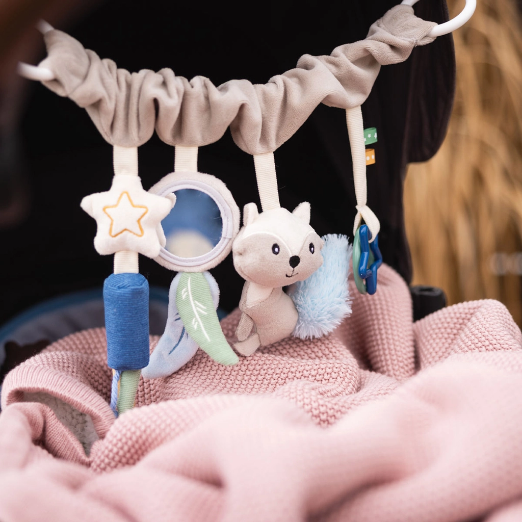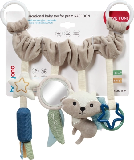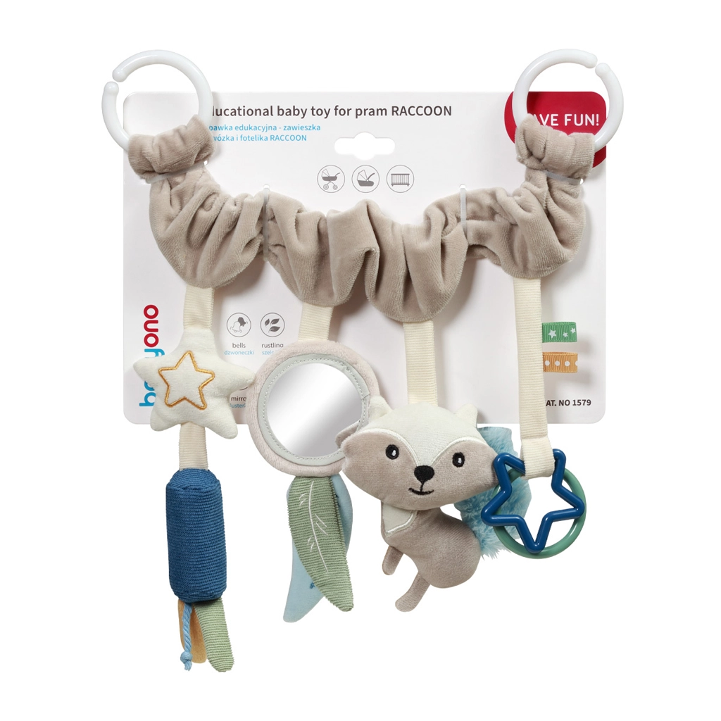 Lok BABYONO Raccoon dojenčku prinaša raznoliko senzorično stimulacijo med sprehodi in potovanji. Zahvaljujoč univerzalnemu prijemu ga zlahka namestite na voziček, avtosedež ali posteljico. Mehki materiali so nežni do otroške kože, varna zasnova pa podpira vizualni in taktilni razvoj.