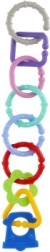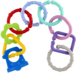 Obročki in oblike se preprosto povezujejo in trdno držijo skupaj, tako da lahko otroci ustvarjajo verižice ali pripnejo igračke na voziček ali avtosedež.