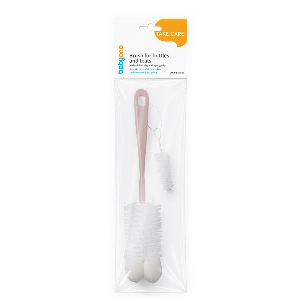 Praktična ščetka BabyOno za temeljito čiščenje dojenčkih stekleničk in dud. Posebno oblikovane ščetine dosežejo tudi težko dostopna mesta, udoben ročaj zagotavlja zanesljiv oprijem, gobica na koncu pa olajša čiščenje dna stekleničke. Del paketa je mini ščetka za dudi in praktičen sistem njenega shranjevanja.