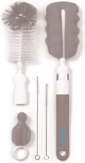 - Krtača za stekleničke z 2 zamenljivima nastavkoma (mehke ščetine, elastična goba), gobica/krtača za dudo