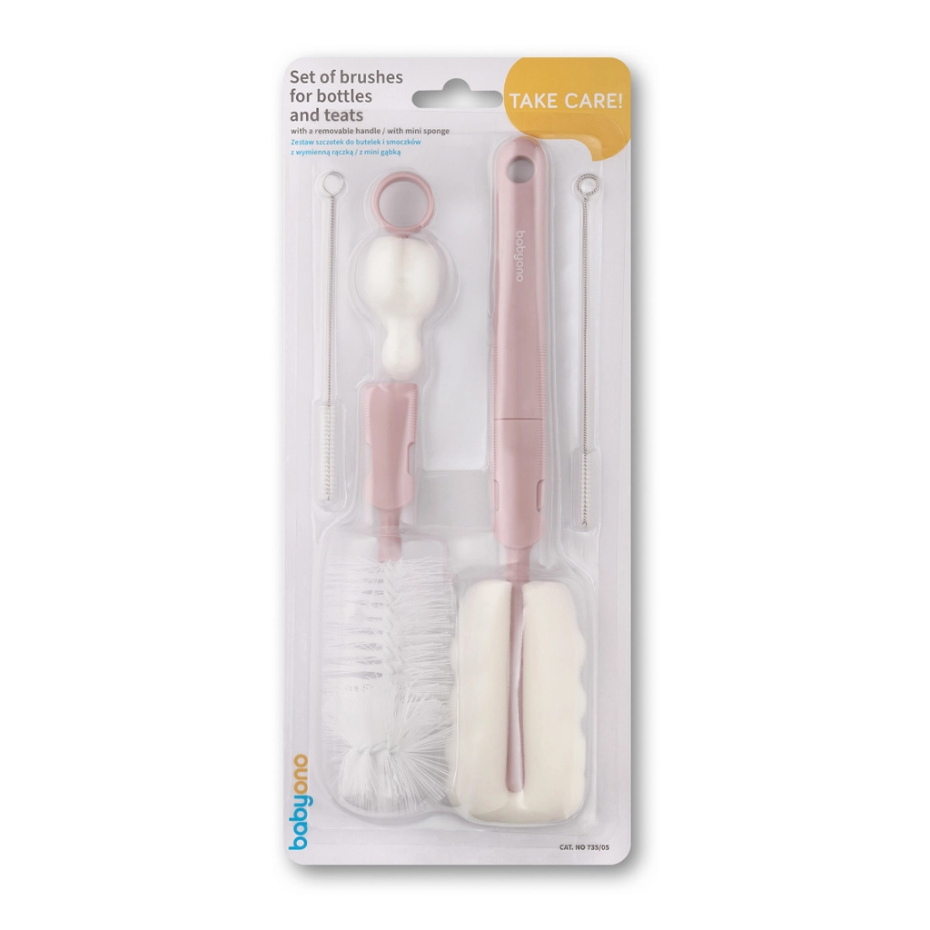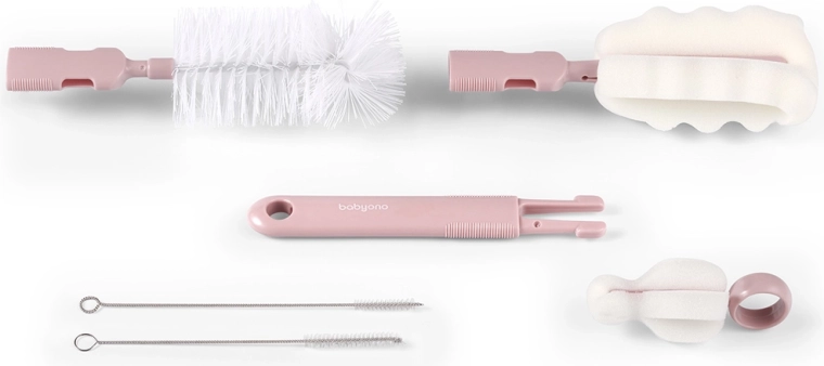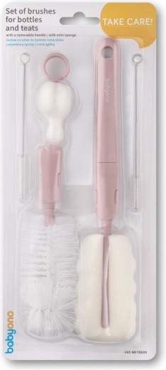 Komplet ščetk BABYONO je zasnovan za preprosto in higiensko čiščenje vseh pripomočkov za hranjenje in nego dojenčka. Zamenljive ščetke in gobice prilagodite obliki stekleničke in cuclja, zato odstranite nečistoče tudi iz ozkih vratov in kotov. Odstranljiv ročaj in obešalne odprtine zagotavljajo udobno uporabo in hitro sušenje.