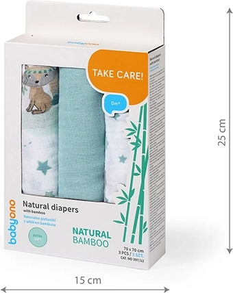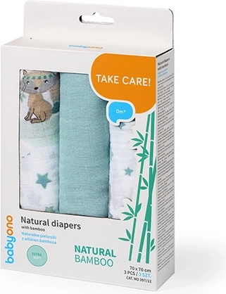Komplet treh bambusovih muslinastih pleničk BABYONO velikosti 70 × 70 cm je idealen od rojstva naprej. So izjemno mehke, zračne in nežne do občutljive kože. Uporabite jih kot povijanko, lahko odejico, previjalno podlogo, pri dojenju ter kot brisačko ali tolažilko za spanje. Zaradi bambusovih vlaken so naravno antibakterijske in odporne proti neprijetnim vonjavam.