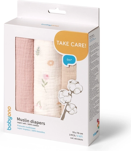 Set treh muslinastih pleničk BabyOno je vsakodnevni pomočnik za dojenčka od rojstva. Izdelane so iz 100 % bombaža, izjemno mehke, zračne in vpojne. Zaradi naravno nagubane strukture ne zahtevajo likanja in z vsakim pranjem postanejo še mehkejše. Idealne za previjanje, povijanje, kot brisačka, odejica ali slinček doma in na poti.