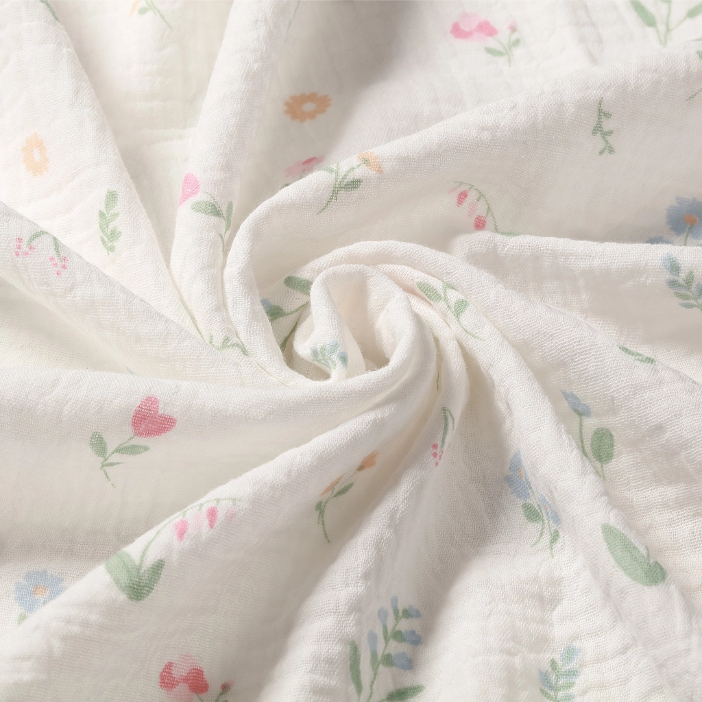 Lahka muslinasta vezava iz 100 % bombaža zagotavlja odlično kroženje zraka, udobje brez pregrevanja in izjemno mehak dotik za novorojenčke.
