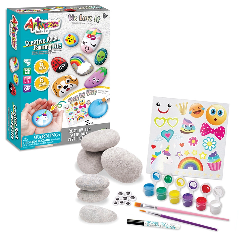 Odkrijte čar ustvarjanja z ustvarjalnim kompletom TASIA za slikanje na kamne. V paketu prejmete 6 gladkih kamnov, 6 akvarelnih barv, 2 čopiča in nalepke za edinstvene dizajne. Komplet podpira ustvarjalnost, fino motoriko in potrpežljivost ter je idealen za otroke od 8. leta dalje.