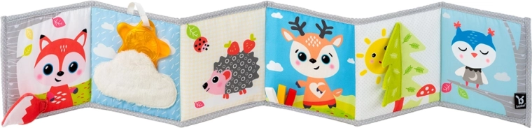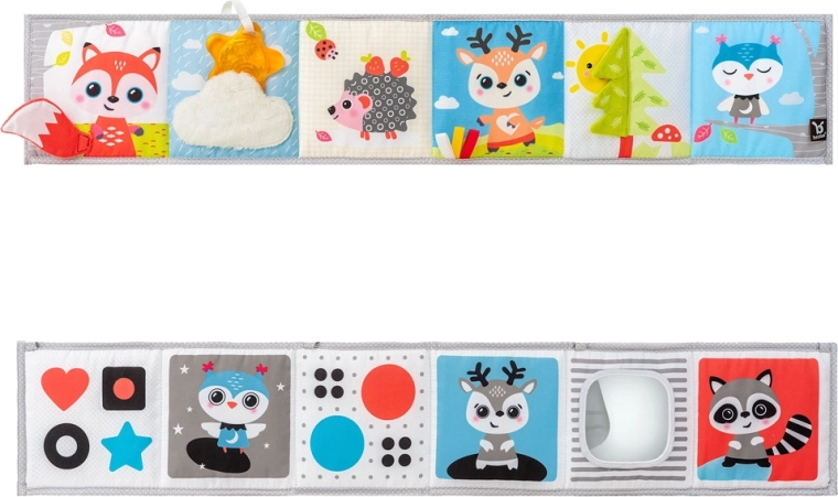 Obojestranska aktivna knjižica BENBAT Gozdni prijatelji raste z vašim dojenčkom. Stran z visokim kontrastom (črno-bela) idealno stimulira vid novorojenčka, medtem ko barvna stran z veselimi živalicami razvija pozornost in osredotočenost v poznejših razvojnih fazah. Mehki materiali, šušteče cone, tipni trakci in veliko ogledalce vabijo k raziskovanju ter podpirajo fino in grobo motoriko.