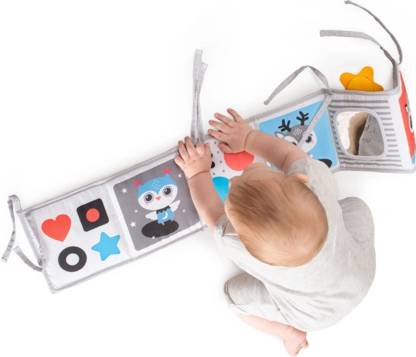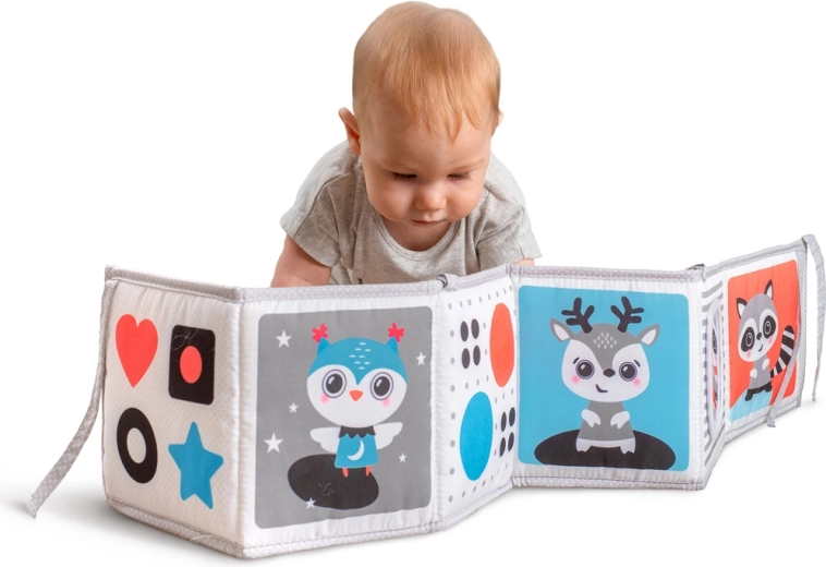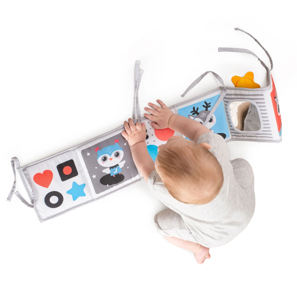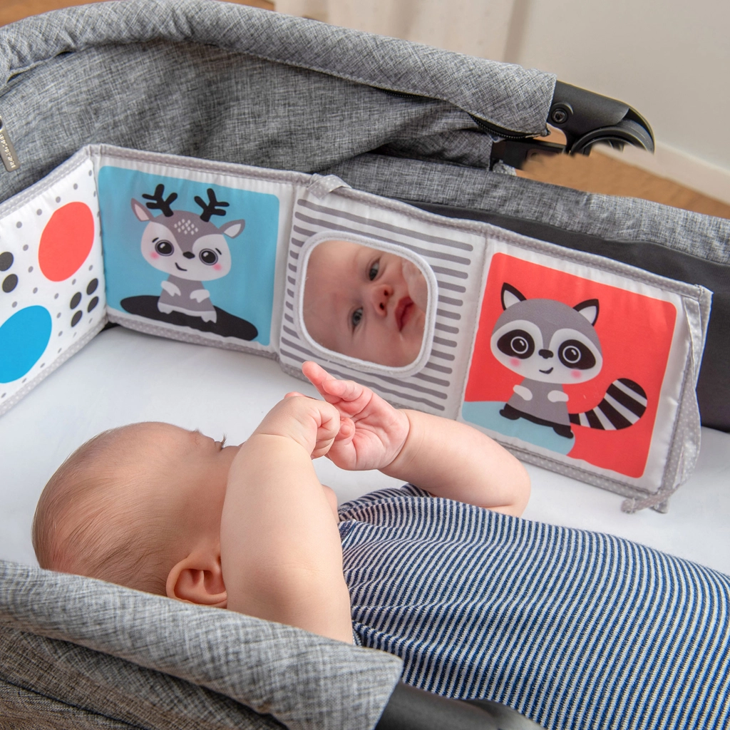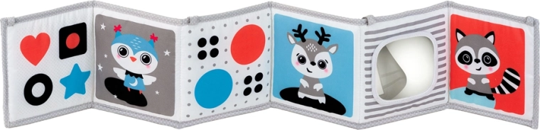 Mehka tekstilna knjižica za dojenčke od rojstva naprej podpira vizualno stimulacijo, čas na trebuščku in senzorično raziskovanje. Ponuja črno-belo stran za novorojenčke in barvno stran za naslednje razvojne faze, veliko varno ogledalce, šušteče in tipne elemente ter možnost postaviti, položiti na ravno podlago ali privezati v posteljico ali voziček. Zlahka se zloži in jo vzamete s seboj kamorkoli.