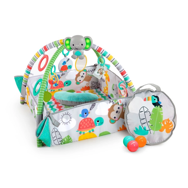 Ta večnamenska igralna podloga BRIGHT STARTS Your Way Ball Play Totally Tropical spremeni vsak trenutek počitka v čutno dogodivščino. Zahvaljujoč nastavljivim stranicam jo v hipu spremenite v ograjo ali ball pit, žogice pa ostanejo lepo skupaj. Dva mehka, oblo oblikovana loka z igračami na C-obročkih vabita k stezanju, prijemanju in opazovanju ter podpirata grobo in fino motoriko.