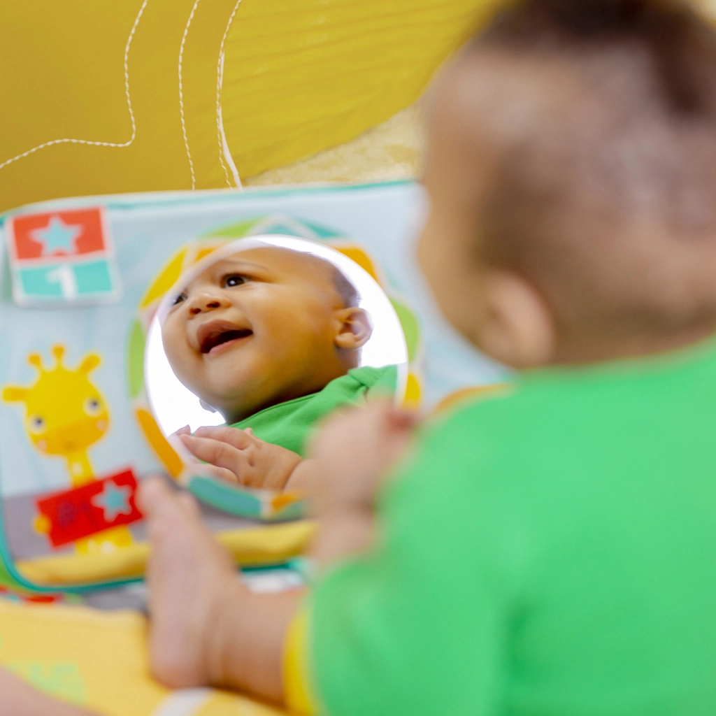 Občutljiva podloga nagrajuje vsako brco in dotik z več kot 30 melodijami, zvoki in svetlobnimi učinki – motivira k gibanju ter krepi nogice in trebušček.