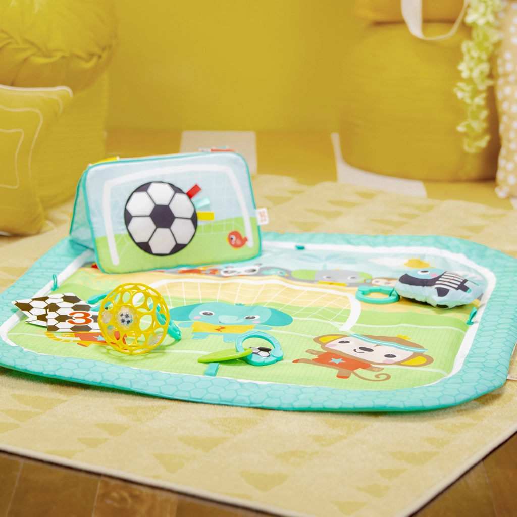 Vključuje 4+ odstranljivih igrač: kartice s številkami in živalmi, plišasti tukan z zvončkom, teksturirani listi – grizalo in klasični, enostavno oprijemljivi OBALL. Podpirajte prve »gole« vašega malega nogometaša vsak dan.