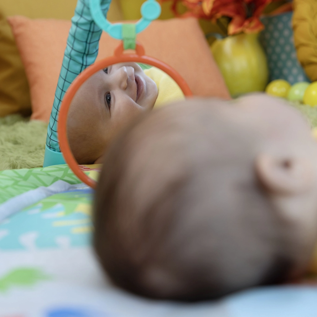 Varnostno ogledalce, obročki, sonček in listasto grizalo spodbujajo samozavedanje in senzorični razvoj.