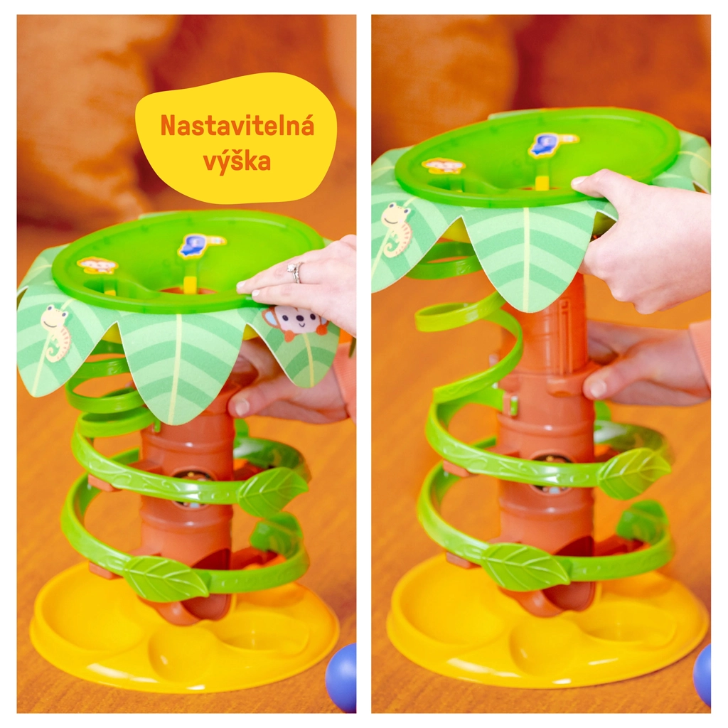 Odkrijte zabavno kroglično stezo, ki razvija čute in motoriko otrok od 6 mesecev naprej. Z več kot 50 melodijami, zvoki in lučkami prinaša igrivo učenje vzroka in posledice. Otroci lahko mečejo žogice v krošnjo drevesa, jih spremljajo po spiralni stezi, pritiskajo svetleča glasbena gumba z opico in tukano ter se plazijo in lovijo žogice po tleh. Nastavljiva višina raste skupaj z otrokom, varna osnova pa služi kot držalo in sprostilnik žogic.